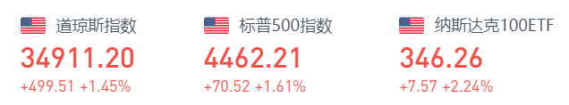 周二美股三大股指集体收涨,道指 $DJI 涨499.51点,涨幅为1.45%,报34911.20点;纳指 $IXIC 涨287.30点,涨幅为2.15%,报13619.66点;标普500指数 $SPX 涨70.52点,涨幅为1.61%,报4462.21点。
