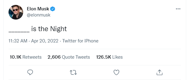 马斯克(Elon Musk)今日在推特上发布了一条神秘的消息:_______is The Night。部分人士猜测缺失的英文单词是“Tender(要约收购)。也有部分人士猜测缺失的单词是Tonight,因为马斯克用了七个下划线(可能暗示7个字母)。
