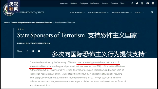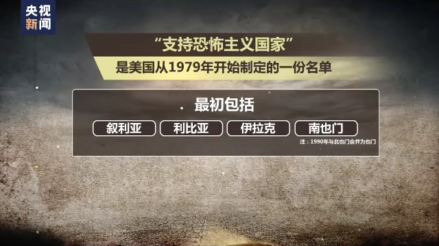 所谓的“支持恐怖主义国家”是美国从1979年开始制定的一份名单,最初包括叙利亚、利比亚、伊拉克和南也门(注:1990年与北也门合并为也门)。目前包括叙利亚、古巴、伊朗和朝鲜。此外,苏丹于1993年至2020年期间也曾被列入该名单。