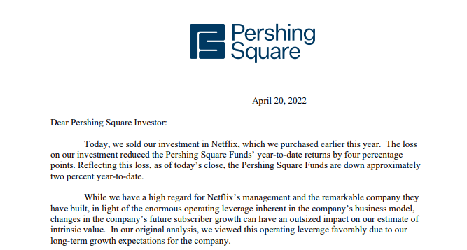 就在不到一个月前的3月29日,阿克曼还曾在潘兴广场的年度报告中称赞奈飞是一家“处于有利地位的公司,是流媒体长期增长的主要受益者,这是一项由世界级管理团队监督的高质量业务…我们认为,奈飞目前的估值与它的内在价值相比存在很大折扣,因为它具有良好的质量和非凡的增长潜力。”