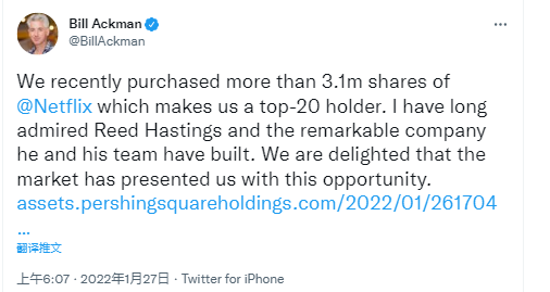 今年1月27日,阿克曼在推特上宣布其购买了超过310万股奈飞股票,这也使得他成为了奈飞公司最著名的支持者之一。然而在持仓仅仅一季度后,随着奈飞财报暴雷,阿克曼迅速做出了反应——卖出了所有的股票。