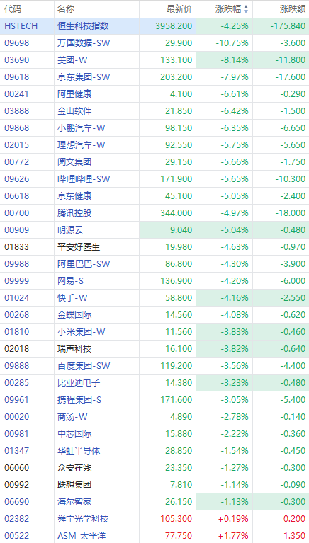 4月21日,港股科技股跌幅扩大,恒生科指跌约4.2%。ATM等大型科技股、互联网医疗股及汽车股跌幅居前。万国数据(09698.HK)跌10.75%,美团(03690.HK)跌8.14%,京东(09618.HK)跌近8%,腾讯控股(00700.HK)跌近5%,阿里巴巴(09988.HK)跌4.3%。