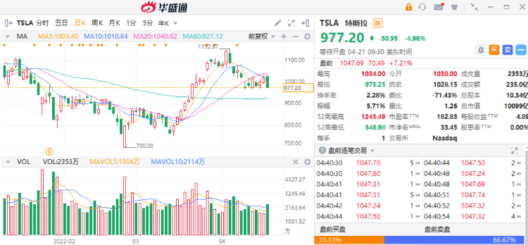 - 北京时间4月21日,特斯拉在美股交易时间盘后正式公布了2022年Q1的财报,营收和净利润双双超预期,特斯拉营收达到188亿美元,同比增长81%,续创单季历史新高;净利润达到惊人的33.18亿美元,市场预期为21.5亿美元,同比大增658%;汽车毛利率跃升到32.9%。该股今日盘前涨超7%。