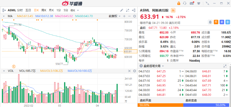 - 光刻机巨头阿斯麦周三公布了2022年Q1业绩。其Q1净销售额录得35.34亿欧元,净利润录得6.95亿欧元,分别高于市场预期的34.4亿欧元和6.21亿欧元;Q1毛利率为49.0%。该公司还预计,Q1净销售额为51亿-53亿欧元(市场预期为58.6亿欧元),全年收入将增长约20%。该股目前周涨约6%。
