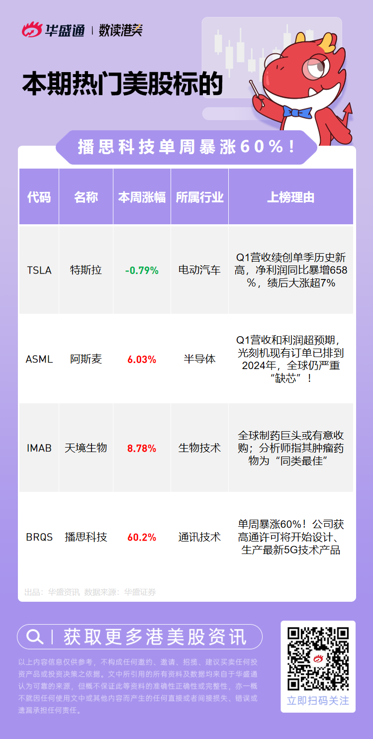 美股风向标 | 单周飙涨60%!播思科技获高通5G许可;特斯拉Q1净利暴增658%