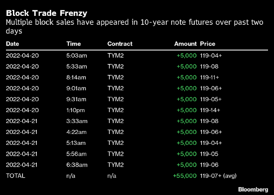 过去两天,多达11宗10年期国债期货的大宗交易以每次5,000手的规模抛售。总计有55,000份合约成交,以现货计基点风险约400万美元,相当于抛售当前总值50亿美元的10年期现货国债。