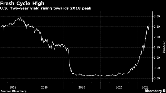 对政策敏感的两年期收益率攀升14个基点,至近2.72%的周期新高,5年期收益率升幅类似,达到3%,为2018年末以来的最高水平。交易员押注,美联储5月、6月和7月会议每次都将加息50个基点。市场还开始押注5月或6月政策会议加息75个基点的可能性。卖压在整条曲线上蔓延,7年期收益率上升13个基点,至3%。