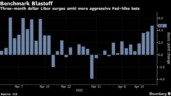 周四美元Libor连续第10个交易日上涨,触及1.184%,而4月7日时还不到1%。该利率本周的上涨尤其抢眼,因为多位美联储官员发表讲话,表明通胀持续高企可能使美联储有必要在5月会议上加息50个基点,并在今年剩余时间以相对较快速度加息。