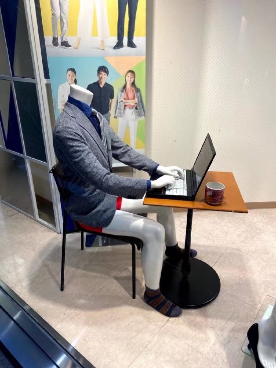 第一次在社交网络上引起巨大反响后,公司又引入了人们在居家办公时参加线上会议时的场景:只有上半身穿着西装,下半身穿着短裤在工作的人体模型在京都河原町店的橱窗里展示,再次成为了话题。