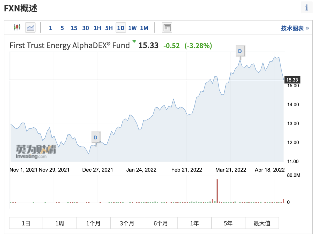 FXN今年以来已经累计上涨了38.4%,过去12个月累计上涨了67.4%,该基金4月19日创下了多年来的新高,目前的P/E和P/B分别为19.66和2.45倍。