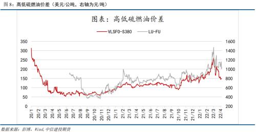 随着俄乌局势降温,市场对石油供应紧张情绪缓解,海外成品油裂差高位回落,其中西欧柴油裂差从每桶40美元上方跌去八成令低硫裂差也大幅回调,低硫燃料油回归自身基本面,Hi5回落至150美元附近。今年前四个月地缘局势成为高低硫燃油价差大幅波动的主要因素。