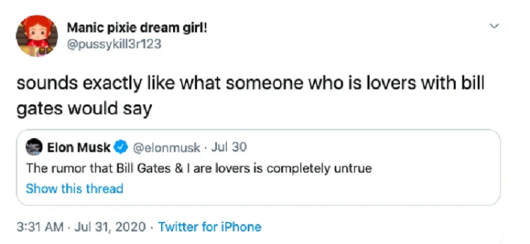 马斯克对此发文表示:每次和盖茨说话我都会被气到,有关于比尔盖茨和我是一对的绯闻完全是假的。网友调侃:只有真恋人才会这样“辟谣”。
