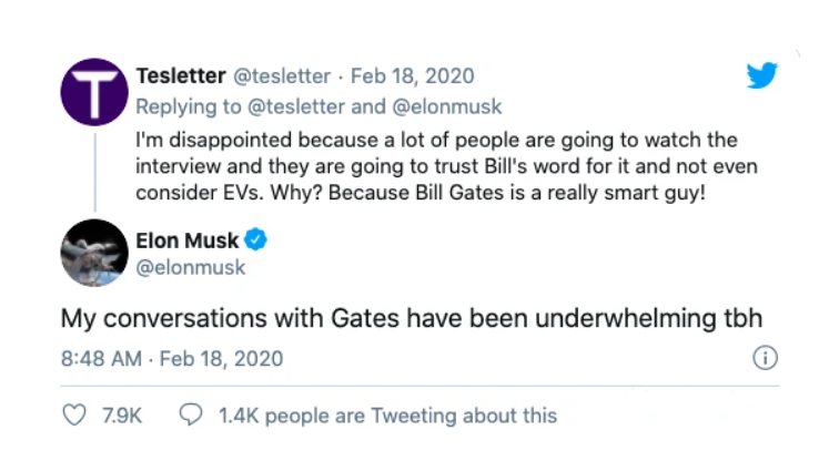 在2020年初,盖茨曾毫不留情地批判马斯克:我觉得他火箭和电动汽车造的不错,但最好不要在自己完全不熟悉的领域(疫苗)乱讲话。还有,我买的电动车是保时捷Taycan,体验还不错哦。