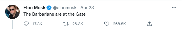 随后,马斯克在推特单独发布一条推文:The Barbarians are at the Gate(野蛮人在门口),双关暗讽:“野蛮人站在盖茨(Gate)那一边”.