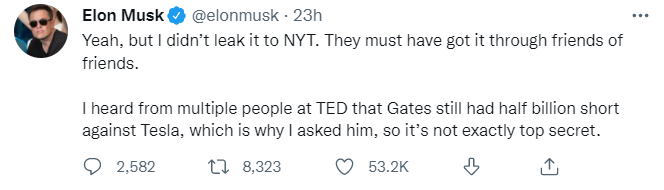 该网友艾特马斯克询问是否真实。马斯克给出了肯定的回复,并无辜地表示:泄露聊天记录给纽约时报的不是我,再说了,许多人都知道盖茨看空特斯拉,这不是什么真正的秘密。