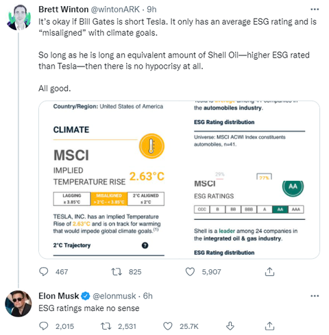 冲浪15小时后,马斯克又回到了“主战场”,回复网友Brett Winton发布内容:比尔盖茨做空特斯拉也没毛病。特斯拉的ESG评级只达到了平均水准,还被评价为:与气候目标“不一致”。只要他做多等量壳牌石油公司(ESG 评级高于特斯拉),就完全没有虚伪。挺好。