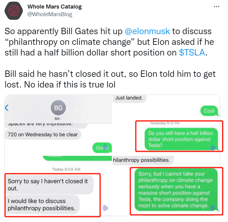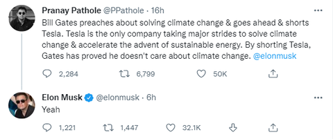随后马斯克回复网民Pranay Pathole发布内容:比尔·盖茨宣扬解决气候变化问题,却继续做空特斯拉。特斯拉是唯一一家在解决气候变化和加速可持续能源出现方面取得重大进展的公司。通过做空特斯拉,盖茨证明了他并不关心气候变化。
