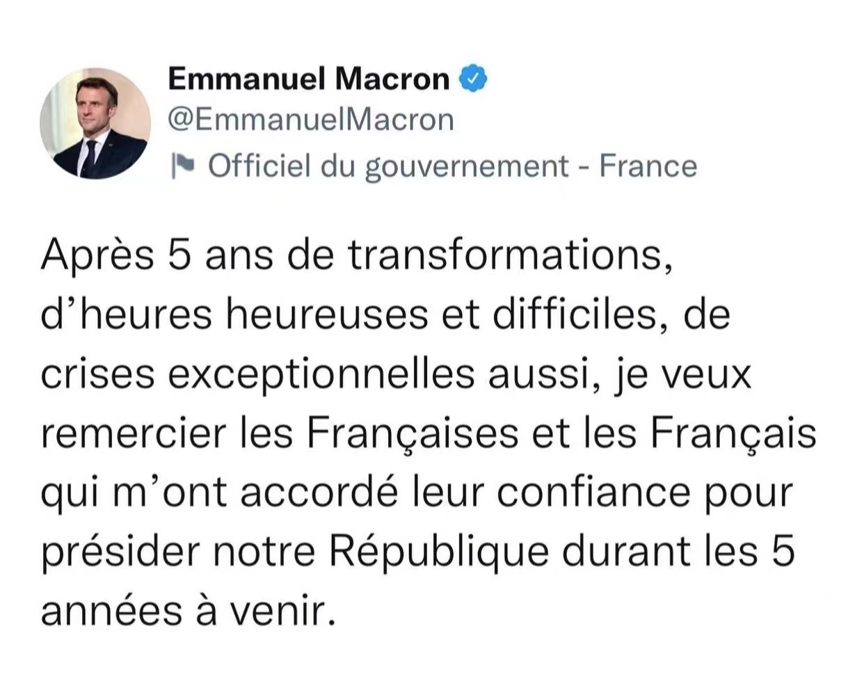 当地时间4月24日晚,法国总统马克龙胜选后,在其个人社交媒体上表示,在过去五年,法国经历了种种变革,有欢乐的时光,也有艰难的时刻,以及前所未有的危机。他感谢法国人民对他的信任,信任他在接下来的五年中继续领导法国。
