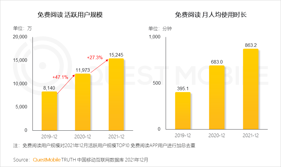 Questmobile数据显示,2019年至2021年,免费阅读活跃用户规模从8140万增至1.52亿,月人均使用时长也从395分钟提至863分钟。