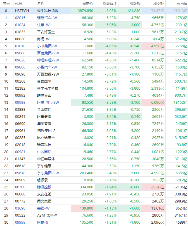 成分股方面,大型科网股、回港中概股下挫,快手跌5.06%,B站跌4.36%,报162.5港元每股,小米、百度跌逾4%,阿里跌3.58%,网易、美团、腾讯跟跌。