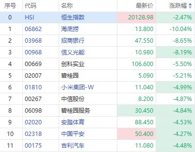 受疫情冲击,二季度经济预期面临下行压力,今天港股三大股指继续呈现下跌态势。港股恒生指数跌超2%,成分股普遍下行,其中海底捞跌超10%,招商银行、信义光能等跌超8%,小米集团、碧桂园服务等跌幅扩大近5%。