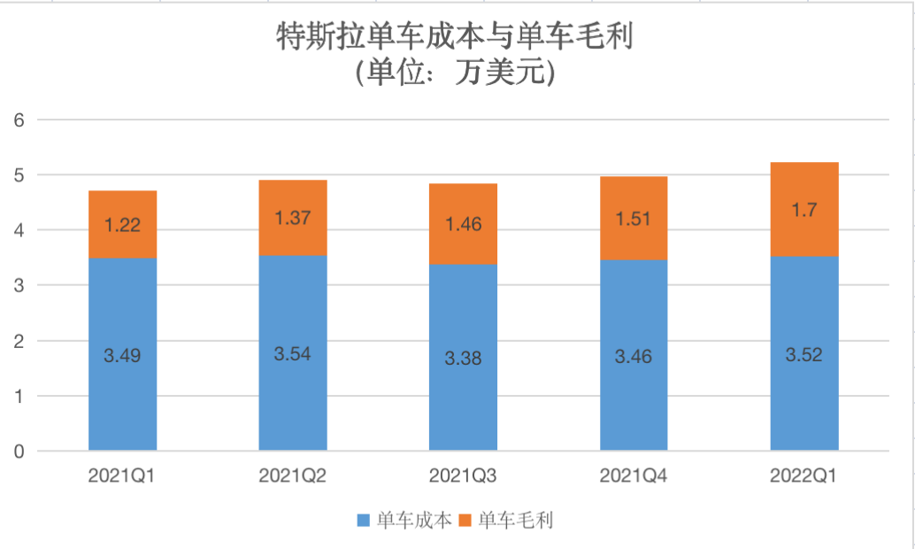 其汽车销售成本增速为69%,低于收入增速。同时,根据《超源力》测算,特斯拉2022年第一季度的每台的平均生产成本为3.52万美元,而2021年同期则为3.49万美元,两者相差无几。这在上游原材料上涨的背景下尤为难得。