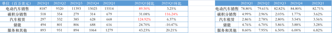 特斯拉的业务布局,有点类似“一带多”的卫星式,电动汽车销售为主,辅以汽车租赁、储能、服务以及碳积分销售。