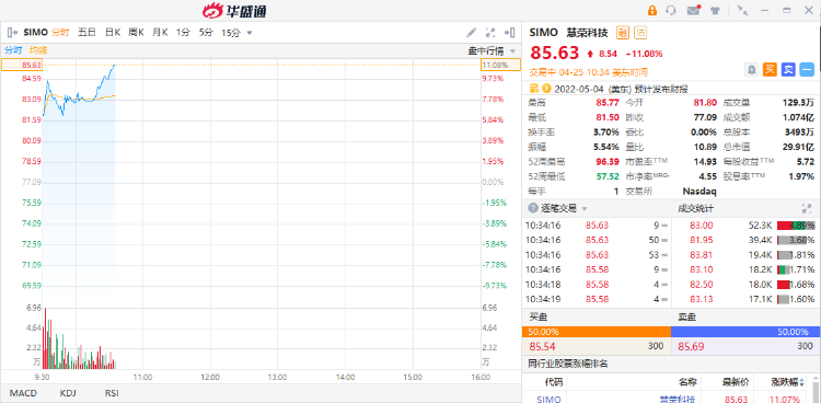 华盛资讯4月25日消息,美股盘中,热门中概股短线拉升,慧荣科技(SIMO)涨超11%,报85.63美元。