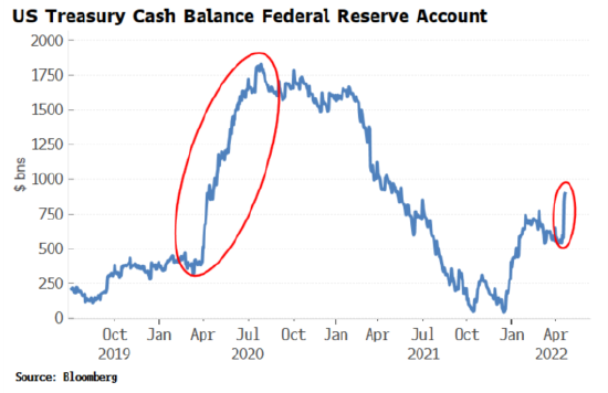我们还看到,随着缴税增加,财政部在美联储的账户余额在2020年这个时候也开始上升。那一年,财政部允许其账户余额继续上升,以积累资源应对疫情。