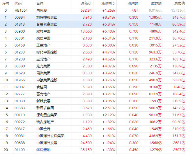 华盛资讯4月26日消息,港股部分内房股走高,截至发稿,旭辉控股涨8.31%,报3.91港元每股,成交额1.38亿港元;合景泰富涨5.84%,绿城中国、融信中国、正荣地产涨超5%;碧桂园涨3.65%,报5.39港元每股;富力地产、新城发展涨3%,中国金茂、中国海外发展、华润置地跟涨。