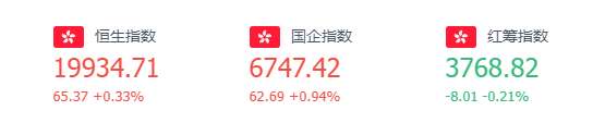 截至4月26日周二收盘,恒指涨0.33%,报19934.71点,国企指数涨0.94%,红筹指数跌0.21%。恒生科技指数反弹涨2.87%,京东、百度涨超5%,快手、美团涨超4%,阿里巴巴涨3.73%,腾讯涨2.57%。