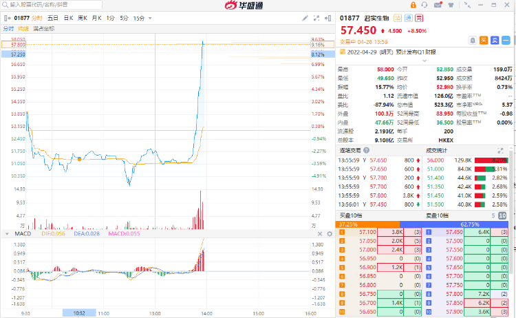 华盛资讯4月28日消息,君实生物AH股午后直线拉升。截至发稿,君实生物A股涨17.56%,报96元每股;H股涨8.5%,报57.45港元每股,成交额8424万港元。