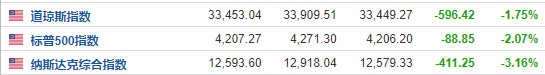 截止发稿,以科技股为主的纳斯达克指数跌超3%,较其历史高点已累跌超22%;标普500指数跌超2%,道琼斯指数跌超1.7%。
