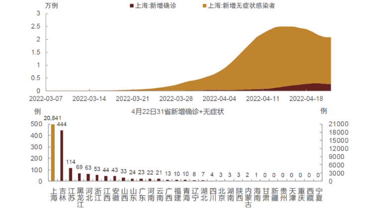 图表2:上海新增确诊及无症状感染者(上图,为7天移动平均);31省新增病例情况(下图,为7天移动平均)