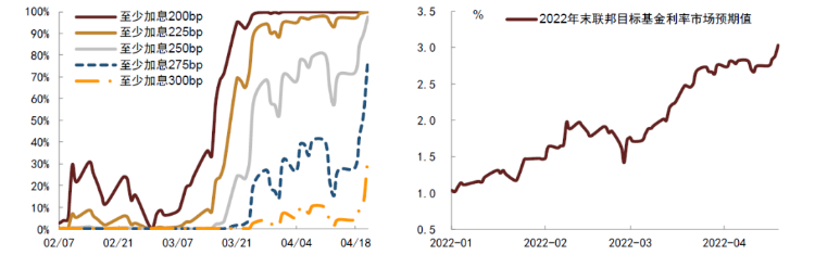当前美国经济动能仍有一定韧性,比如4月密歇根大学消费者信心指数回升,显示美国居民消费短期内仍有支撑。同时4月以来油价也有所回升,美国通胀压力仍在。我们认为在供给结构性问题尚未解决的情况下,美联储需要通过进一步收紧货币政策以减弱需求,进而遏制通胀,不排除其在年末时点会将基准利率抬升至2.0%-2.5%甚至2.5%-3.0%的可能,并且在后续加快缩表速度。美联储主席鲍威尔在本周公开讲话[1]中也表态认为加快加息步伐是合适的,而在市场预期方面,CME利率期货隐含的年末基准利率不低于2.5%的概率也上升至近98%。
