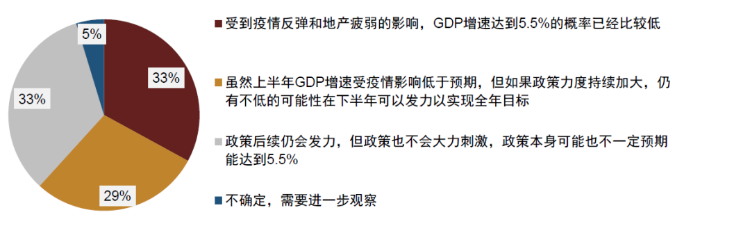 从调查结果来看,超过六成投资者认为今年GDP增速达到5.5%可能有一定难度,其中33%的投资者认为受到疫情反弹和地产疲弱的影响,GDP增速达到5.5%的概率已经比较低,另有33%的投资者认为政策后续仍会发力,但政策也不会大力刺激,政策本身可能也不一定预期能达到5.5%;仅有不到三成投资者认为虽然上半年GDP增速受疫情影响低于预期,但如果政策力度持续加大,仍有不低的可能性在下半年可以发力以实现全年目标。从目前的情况来看,全国疫情反复仍在,并对服务业、生产和消费造成持续扰动,而且地产下行趋势也在延续,这些一定程度上可能都意味着想要实现5.5%的经济目标仍面临不低的挑战。在这种情况下,我们预计后续政策可能会进一步发力以支持并托底经济。