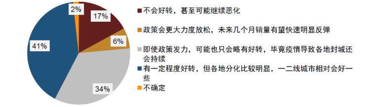 从调查结果来看,绝大多数投资者认为5-7月份,地产销量可能边际好转,但改善不会很明显。超过四成投资者认为5-7月,地产销量可能有一定程度好转,但各地分化比较明显,一二线城市相对会好一些;另有34%的投资者认为即使政策发力,可能只会略有好转,毕竟疫情导致各地封城还会持续;甚至有17%的投资者认为地产销量不会好转,甚至可能继续恶化;仅有6%的投资者认为地产政策会更大力度放松,未来几个月地产销量有望快速明显反弹。尽管房地产政策持续出现放松迹象,但居民购房需求依然低迷,这一方面是因为疫情形势升级限制了居民购房活动,另一方面在疫情冲击居民就业和收入以及股市低迷的情况下,居民消费和加杠杆的能力也受到明显制约。在这种情况下,我们认为后续地产销量改善的速度和程度可能都相对有限。