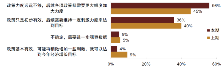 从调查结果来看, 相比于上期问卷,本期有更多投资者认为目前的政策力度还不够稳增长,其中认为政策力度远远不够,后续各项政策都需要更大幅度加大力度的投资者占比由上期的45%提升至56%;而认为政策只是初步有效,后续需要维持一定刺激力度来达到目标的投资者占比则由上期的40%下降至36%;认为政策基本有效,可能再稍微增加一些刺激,就可以达到今年经济增长的目标的投资者占比则由上期的9%下降至4%。