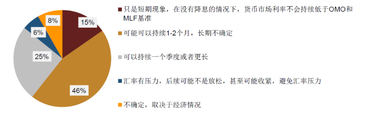 从调查结果来看,多数投资者认为资金面短期内还是会维持宽松,其中25%的投资者认为资金面宽松可以持续一个季度或者更长时间;46%的投资者认为可能可以持续1-2个月,长期不确定;15%的投资者认为资金面宽松只是短期现象,在没有降息的情况下,货币市场利率不会持续低于OMO和MLF基准;仅有6%的人认为由于汇率压力,后续可能不是放松甚至是收紧。