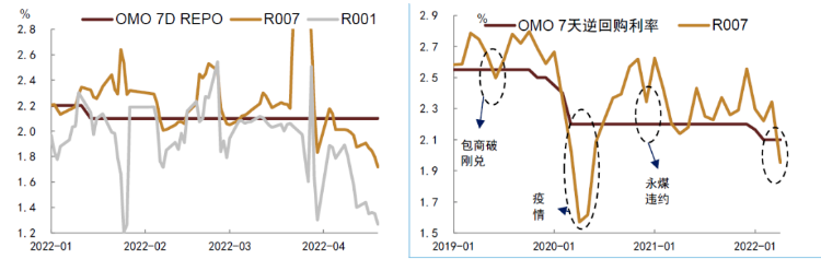 整体来看,投资者对二季度资金面的平稳担忧不大。央行4月再次降准0.25个百分点,释放中长期资金约6000亿元,新增两项结构性货币政策工具额度2400亿元,叠加其靠前发力加快已向中央财政上缴结存利润6000亿元(与全面降准0.25个百分点基本相当),目前银行间流动性整体合理充裕。同时我们观察到近期货币市场利率与央行公开市场操作利率的偏离度也有所加大,一定程度上表明虽然央行名义上没有降息,但货币市场利率的隐性下限却有阶段性的打开。在2020年上半年货币市场利率大幅偏离公开市场操作利率后,2021年开始,央行开始强调引导货币市场利率围绕公开市场政策利率波动,对应我们可以看到2021年以来,货币市场利率与政策利率的背离较为少见。但过于一致的走势也导致了央行边际调控的灵活性有所降低。过去几次银行间流动性相对承压阶段,包括包商破刚兑、疫情、永煤违约等,均是依靠货币市场利率阶段性下行并低于基准利率,来缓解潜在的流动性冲击,并最终重新刺激货币流通速度。