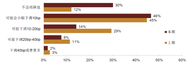 从调查结果来看,投资者对后续调降名义政策利率的预期仍在,但相比3月调查而言预期有所走弱。主流投资者仍然认为后续可能会小幅下调10bp,占比46%,但预期下调更大幅度(10bp以上)的投资者占比较上期有较为显著的下降,从43%下降至24%;认为不会再降息的投资者占比从上期12%上升至30%。