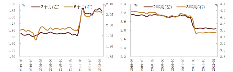 图表18:1年期以下大额存单平均利率(左);1年期以上大额存单平均利率(右)
