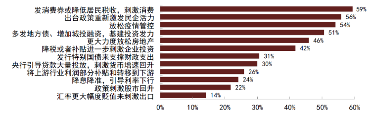 从调查结果来看,投资者对如何刺激经济回升观点不一,较多的投资者认为可以刺激消费、激发民企活力、放松疫情管控和加大基建投资。具体来看,59%的投资者认为可以通过刺激消费来刺激经济回升,可以通过发消费券或降低居民税收实现;56%的投资者认为可以出台政策重新激发民企活力;54%的投资者认为可以放松疫情管控措施;51%的投资者认为可以通过基建投资发力刺激经济,包括多发地方债,增加城投融资;46%的投资者认为可以更大力度放松房地产;还有42%的投资者认为可以通过降税或者补贴进一步刺激企业投资。