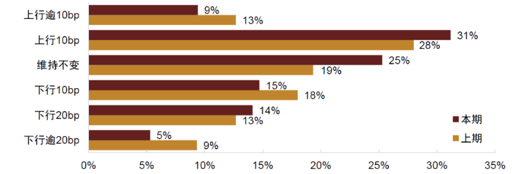 从调查结果来看,投资者对未来3个月10年国债走势分歧较大,相较于上期调查,认为收益率下行的投资者占比有所下降。具体来看,认为未来3个月10年国债收益率会上行的投资者占40%,其中认为上行10BP以内的投资者占31%,认为上行超过10BP的投资者占9%;认为未来收益率维持不变的投资者占25%,较上期下降6个百分点;认为收益率下行的投资者占34%,其中认为下行10BP以内的投资者占15%,认为下行10-20BP的投资者占14%,认为下行超过20BP的投资者占5%。