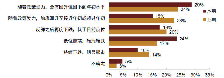 调查结果显示投资者对于中国A股的态度比上一期更偏悲观,且认为A股走势短期内不明朗的投资者占比提升。44%的投资者认为随着政策发力,A股会有所回升,但本期认为政策发力后A股会有回升但回不到年初水平的投资者占比明显上升,达到29%,而认为A股会触底回升至接近年初或超过年初的投资者占比则大幅减少至15%。认为股市走势不明朗的投资者占比提升,约占29%,其中24%认为A股会低位震荡,难涨难跌,5%的投资者表示不能确定。认为股市会继续下跌的投资者占比28%,其中18%认为会在反弹后再度下跌,低于目前点位,10%的投资者认为会持续下跌,进入明显熊市。
