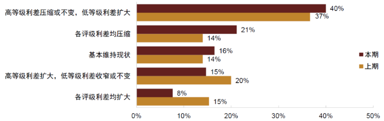 针对未来三个月信用利差的走势的问题,有40%的投资者选择“高等级利差压缩或不变,低等级利差扩大”,相比上次调查时继续小幅上升3%,绝对占比仍然最高;选择“高等级利差扩大,低等级利差收窄或不变”的投资人占比也继续下降5%至15%;“各评级利差均压缩”的比例出现明显上升至21%;“各评级利差均走扩”的比例由15%大幅下降至8%,而“基本维持现状”的比例变化不大,由14%小幅上升至16%。分评级来看,认为低等级利差会扩大的比例为48%,较上期52%的水平下降4%。认为高等级利差会扩大的比例由35%明显下降至23%。总的来说,相比上次问卷调查结果看,市场对信用债的看法较为乐观,无论是高等级还是低等级,认为信用利差会走扩的投资者占比都出现下降,但是认为低等级会走扩的比例仍然接近一半。反映出在负债端企稳且部分信用利差出现回升的情况下,信用债的需求仍在,但是同时对信用风险的担忧也在持续。
