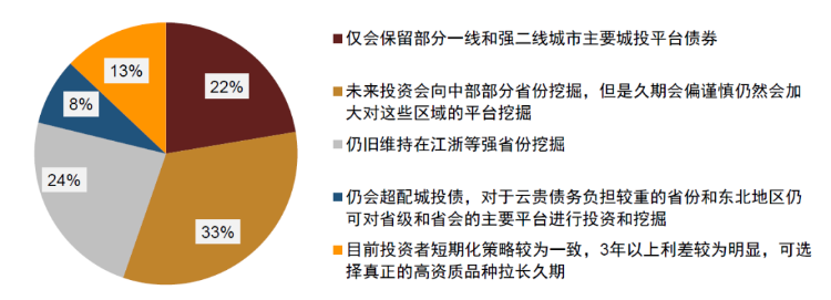 投资者选择 “城投融资政策难有明显放松,城投风险仍高,仅会保留部分一线和强二线城市主要城投平台债券。”的占比为22%;选择“城投融资区域分化格局不改,考虑到东部优质省份收益率偏低,未来投资会向中部部分省份挖掘,但是久期会偏谨慎仍然会加大对这些区域的平台挖掘,获取一定超额收益。”的比例为33%;同时选择“城投融资区域分化格局不改,考虑到中部部分省份卖地收入压力较大,或是到期相对于财力的压力较高,仍旧维持在江浙等强省份挖掘。”的占比为24%。其余选择 “23号文后城投融资政策会有明显放松,城投平台公募债券打破刚兑的可能性仍然较低,仍会超配城投债,对于云贵债务负担较重的省份和东北地区仍可对省级和省会的主要平台进行投资和挖掘。”和“目前投资者短期化策略较为一致,3年以上利差较为明显,可选择真正的高资质品种拉长久期。”的比例不大,分别为8%和13%。整体来看,央行23条出台后,投资者认为城投融资明显放松的占比不足十分之一,其余对城投的区域选择方面仍然集中在中东部省份。其中在久期偏谨慎情况下在中部省份挖掘的占比在三分之一左右,仍在江浙等强省投资的占比在四分之一,仅保留一线和强二线主要城投平台的也在四分之一左右。反映出在土地出让收入下降,以及城投再融资未见放松的情况下,市场对弱区域城投公司仍然十分谨慎的态度。