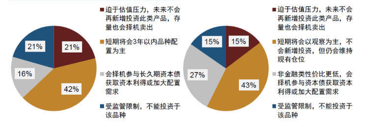 投资者选择占比最高的是“未来供需关系和估值风险存在一定不确定性,短期将会3年以内品种配置为主。”比例变化不大,由上期43%下降至42%;选择“迫于估值压力,未来不会再新增投资此类产品,存量也会择机卖出”的占比出现明显上升,由上期的15%明显上升至21%。选择 “非金融类性价比更低,会择机参与获取资本利得或加大配置需求。”的占比出现明显下降,由上期27%下降至16%;其余选择“受监管限制,不能投资于该品种。”的比例也出现上升,由上期15%上升至21%。整体来看,投资者对银行资本类补充债券的看法相比上期悲观,主要体现在两个方面:未来不新增投资且存量也会卖出投资者占比出现明显上升,目前占比上升至五分之一以上;其次会择机参与获取资本利得或加大配置的投资人占比出现明显下降,目前仅16%。维持现有仓位但期限控制在3年以内的投资者占比仍然最高在四成以上。反映出在当前银行资本补充类债券收益率和利差较低情况下,市场对其需求减弱且久期偏好也在下降。