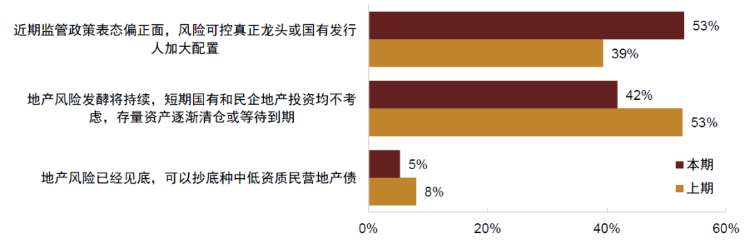 投资者选择占比最高的是“地产风险发酵将持续,短期国有和民企地产投资均不考虑,存量资产逐渐清仓或等待到期。”比例在42%,较上期下降11%;另外有53%的投资人选择“近期监管政策表态偏正面,风险可控品种或国有发行人加大配置”,占比明显上升14%。另外有5%的投资者认为 “地产风险已经见底,可以抄底民营地产债”。整体来看,投资者对地产债投资的看法较上期乐观。主要体现在两方面:1)对风险可控的龙头和国有发行人加大配置的投资者占比明显上升且超过一半;2)不考虑地产投资且存量出清的占比虽然在四成以上但出现明显下降。但是可以投资中低资质民企的投资人占比仍然很低且有所下降,反映出市场在对地产债投资的情绪边际改善下主体的分化也在加大。