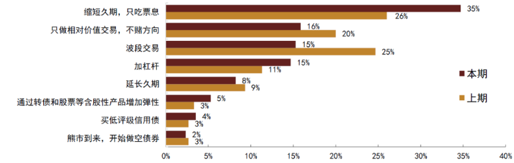 投资策略上,目前投资者仍然更加倾向于缩短久期、相对价值和波段交易。选择缩短久期交易的投资者占比进一步大幅提升,至35%;选择相对价值的投资者占比有一定下降,至16%;选择波段交易的投资者占比亦降至15%;选择加杠杆的投资者占比有小幅提升至15%;选择延长久期的投资者占比和上期相差不大,为8%;选择通过转债增加弹性的投资者占比小幅回升至5%。整体来看,投资者的策略选择一定程度上表明了市场当前对资金面的担忧其实不大,但对整体利率曲线趋势性下移的信心明显不足,从而会更倾向于小幅提升杠杆但延续相对保守的久期策略。此外,相比上期调查,投资者对相对价值和波段交易的关注度也有下降,背后原因可能有二:一是近期债市进入窄幅震荡期,利率变动绝对值的月均值处于历史相对低位,波段交易没有太好的机会;二是相对价值方面,税收利差近期仍在窄幅收窄,除1Y和3Y外其余期限振幅不大,趋势性机会不多,而期限利差虽然有所回升至相对高位(曲线近期走陡),但投资者当前对长端利率顾虑仍相对偏多,因此也不太敢轻易的开始做平曲线,进而也没有太多确定性的操作方向。